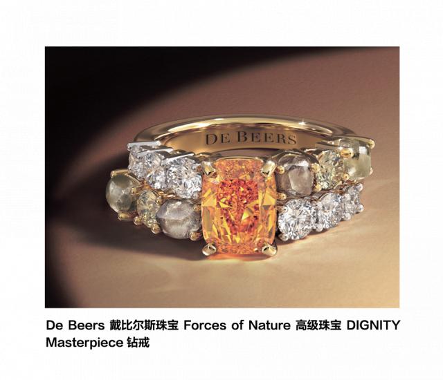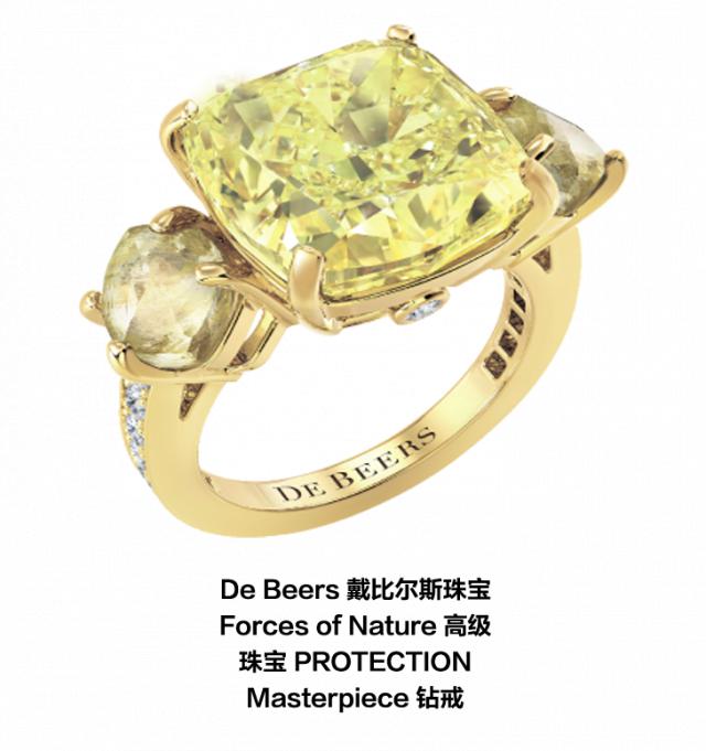 再来看 De Beers 另一件非凡的戴比尔斯珠宝作品—— Protection 「庇佑之力」钻戒,它以 12.54 以克拉枕形切割丰富多彩的黄钻为核心,代表着非洲草原之王狮子的智慧与高贵。这个黄钻来自戴比尔斯。 Natural Works of Art 系列,是大自然赋予的珍贵礼物。这种钻石原石是从博茨瓦纳挖掘出来的,经过戴比尔斯裸钻工匠的巧手雕刻,从一块原石变成了一件耀眼的艺术品。主钻周围有两颗黄色钻石原石,与主钻的浓黄色调相辅相成,代表着品牌与其裸钻来源之间的深厚联系。