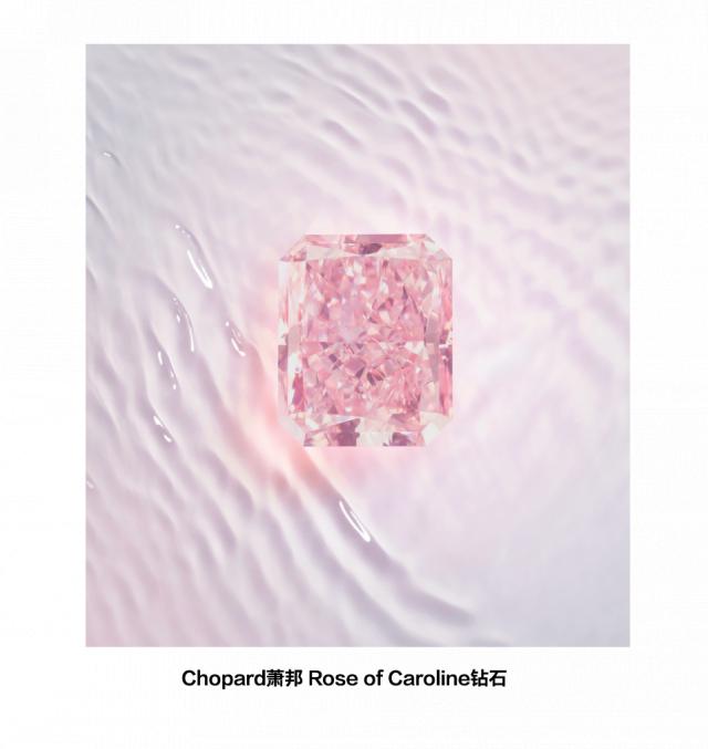 这枚名叫 Rose of Caroline 采用雷迪恩矩形切割的钻石,有 70 一种琢型,比普通裸钻多。这一切割方法促使裸钻在光照下绚丽多彩,晶莹剔透,尽显柔美的粉色色彩。其净度通过美国宝石学院(GIA)钻石分级标准评定为 VVS1 等级,表明其内部几乎没有任何缺陷。Chopard 萧邦把这颗宝石命名为 Rose of Caroline,以此向品牌创意灵魂人物卡罗琳 · 舍费尔致敬。这个名字不仅代表了裸钻的粉红色,也让人想起了卡罗琳最喜欢的花——玫瑰。卡罗琳热爱大自然,她的花园承载着她对宝石的感情。在她的花园里,她欣赏着万象更新、周而复始的自然风光,痴迷于脆弱之美;然而,在珍贵宝石的“花园”里,她环游世界,寻找传奇的宝藏。Rose of Caroline 另外一层含义就是把这颗古老的宝石命名为卡罗琳,这也是 Chopard 萧邦希望向品牌创意灵魂致敬的一种方式。