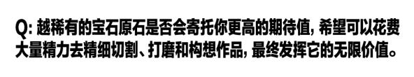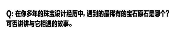 A: 由于其稀缺性,或大家对它的喜爱程度、商业范围内的偏好程度等因素,宝石的审美价值不会改变。我对他们也有同样的爱和爱。我不会放弃我的精力或资金去设计它,因为一块石头价值不高。只要它对我来说很美,它就有足够的吸引力。其中一点就是让我觉得这是美丽的,是迷人的。希望我能倾诉,或解释,倾诉这种感觉,这种感觉,我会不惜一切代价,不惜一切代价去做到最好。对于我来说,所有的宝石都是珍贵、稀有、最美丽的。在目前的珠宝销售中,尤其是在商业范围内,有一种我不同意的观点,那就是某种宝石的替代品。我认为每种宝石都是不可替代的、独特的,没有一种宝石是可以替代的。