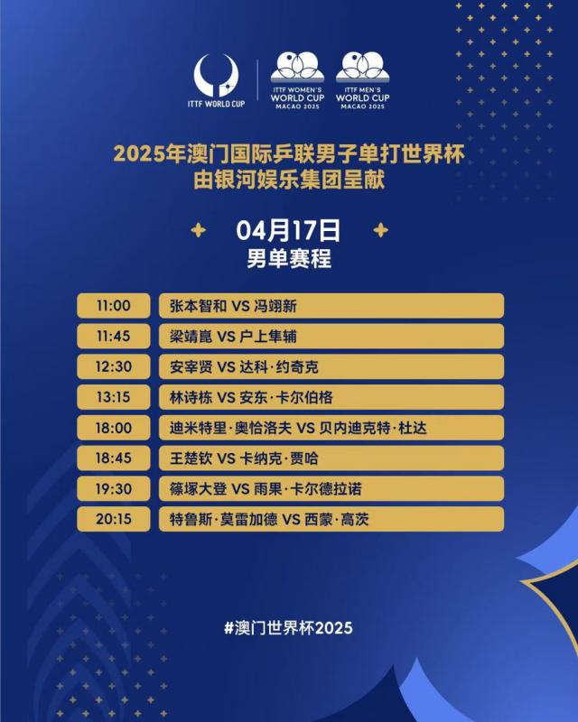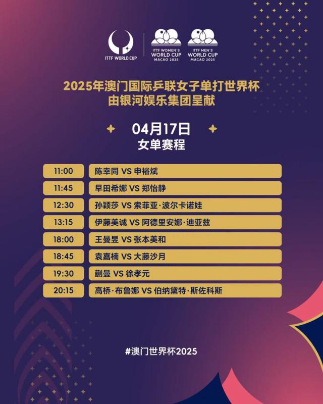 国际乒联澳门世界杯经过三天紧张刺激的预选赛, 4 月 17 每天都进入淘汰赛阶段。16 白天晚上,男女单挑十六强名单全部发布。在国乒派出的十名选手中,林诗栋、王楚钦和梁靖邈进入了下一轮男单,而孙颖莎、王曼昱、陈幸同和她的女单则晋升为四名。在四名男单和四名女单中,日本队成为预选赛的最大赢家,共七人晋升淘汰赛阶段。