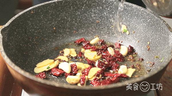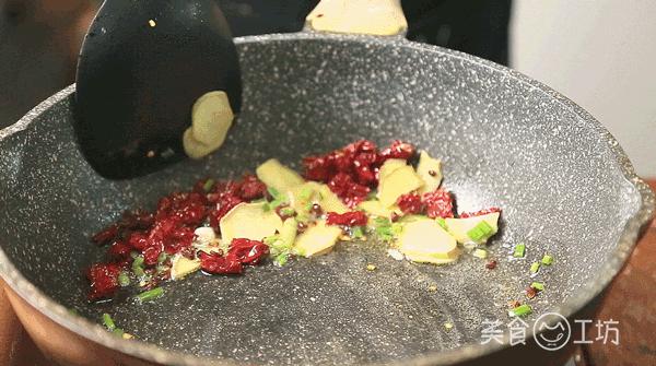 5. 锅内加油,油热后加入干辣椒和花椒爆香,然后加入姜片、大蒜和葱花翻炒。