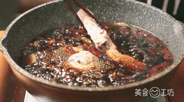 7. 加入香叶,八角,桂皮,酱油,酱油,盐和糖。