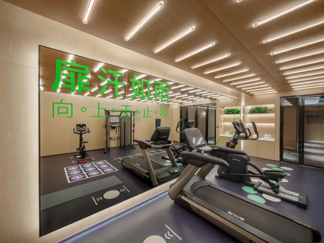 除提供运动场景外, 24 全天候开放服务,更配置品类丰富、一应俱全的健身器材。有趣的是,酒店房间和健身房都配备了健身魔镜设备。作为健康生态的延伸,内置了大量专业科学的健身课程,将个人健身场景融入居住空间,提供身临其境的智能健身指导体验。另外,还配有 Switch 体感游戏,将训练转化为有趣的冲关挑战,消除传统健身的枯燥感。