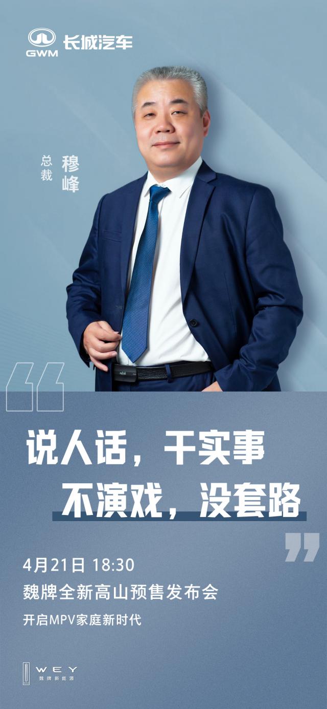 IT 世界注意到,魏牌全新高山预购发布会已正式宣布。 4 月 21 每天举行,号称“开启” MPV “家庭新时期”,slogan 为了“有花式营销的长城发布会”,说实话,做实事,不拍戏,没有招数”。