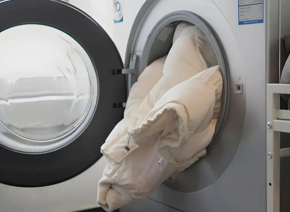 尽量把羽绒服均匀地放在洗衣机里。假如羽绒服太大,可以对折,但是要保证它在洗衣机里摆平。