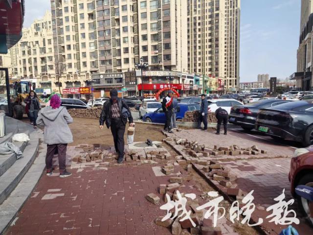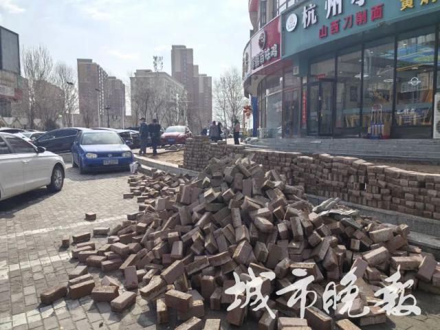 16 日上午,城市晚报全媒体记者来到长春市南关区幸福街与汇福路交汇处,10。 多名建筑工人和几辆叉车正在拆除路口南侧商铺门前的方砖,叉车将拆除后的方砖堆放在路边。