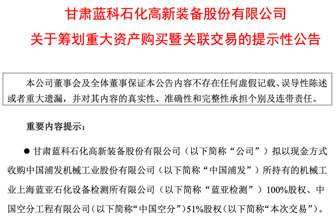 蓝科高新表示,为了巩固公司商品、工程和服务业务三大支柱业务,提高公司在检验检测服务和特色工程承包领域的管理能力和人才团队水平,加强业务获取和管理能力,公司拟收购上海蓝亚石化设备检测所有有限公司(以下简称蓝亚检测)100%股份、中国空分工程有限公司(以下简称中国空分)51%股份,中国浦东发展持有现金。资金来源主要是自有或自筹资金。