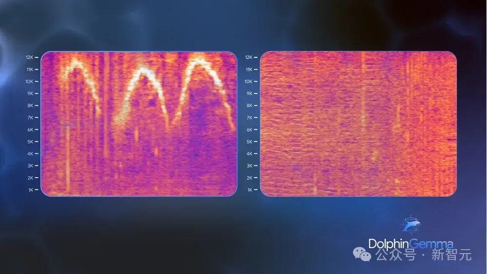 左边:DolphinGemma 在早期检测中产生的哨声(左)和脉冲(右)