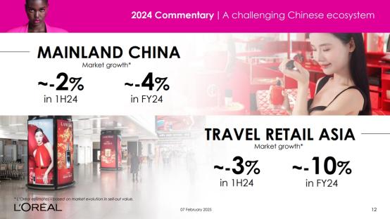 值得注意的是,根据欧莱雅集团公布的2024年全年和第四季度业绩数据,2024年亚洲市场销售额同比下降3.2%,成为集团唯一一个下滑的区域市场。欧莱雅集团也将这一业绩下滑的主要原因归结于中国大陆美容市场的负增长和海南旅游零售销售压力的增加。