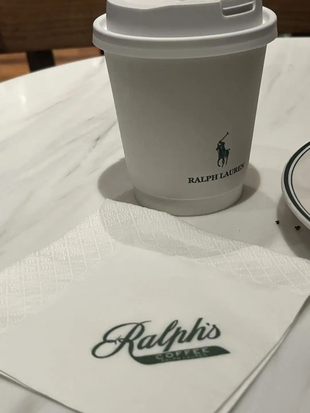 名义上有一个座位区,但实际上店里只有6张桌子,靠近电梯厅。不时有人站在你的桌子前,拿着刚买的拉夫劳伦等电梯。我喝了20多分钟就坐立不安。与老钱风格相反,拉尔夫咖啡默认带纸杯,冷饮用透明塑料杯,连吃甜点的叉子都是一次性的。
