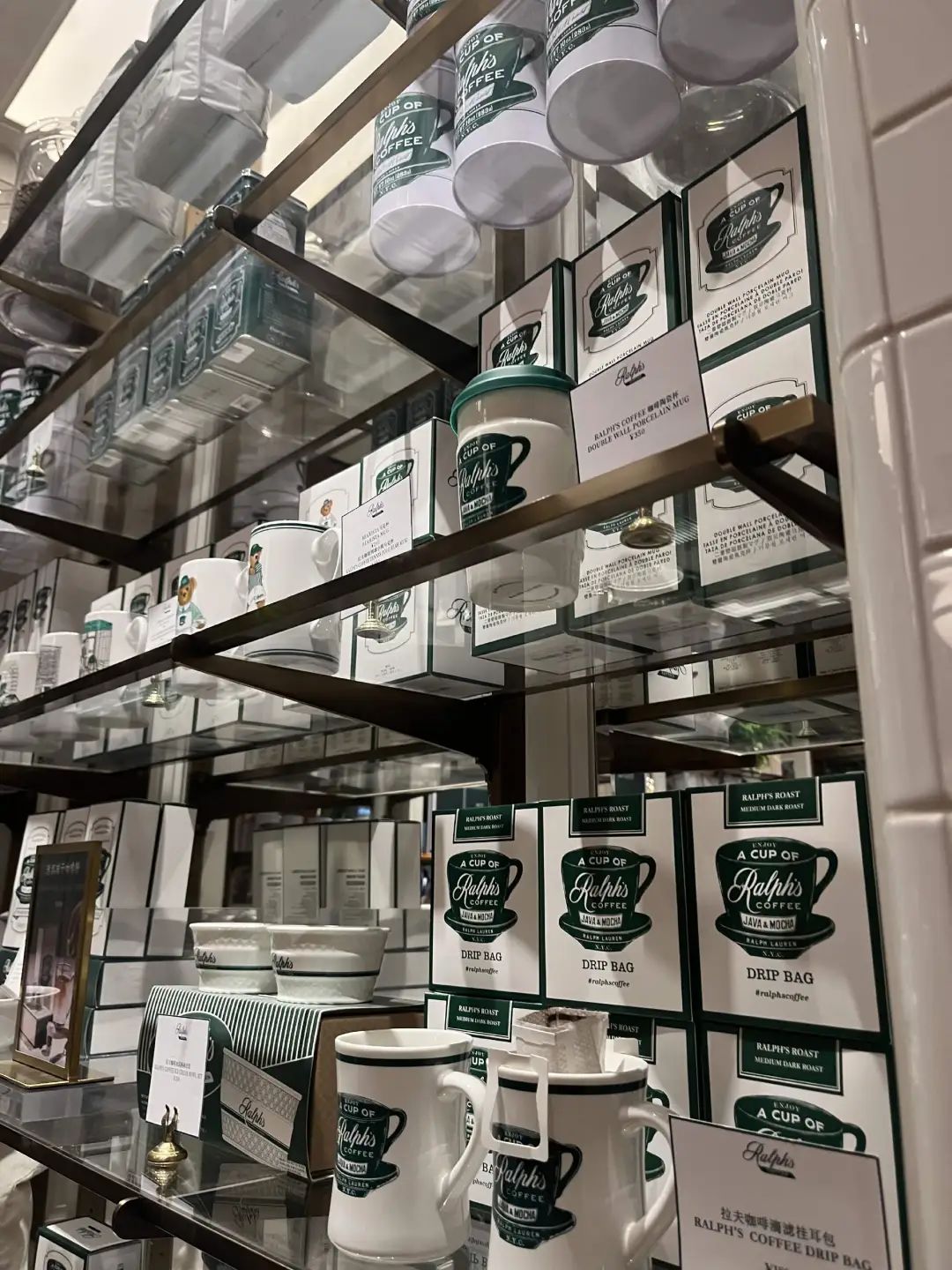 拉夫劳伦的咖啡是由他们自己的“拉夫咖啡豆”组成的。据店员说,“独特的香味”,所以咖啡角的一侧还有一个墙壁展示柜,卖咖啡豆、挂耳咖啡和马克杯,上面印着“Ralph’s Coffee“棒球帽。”