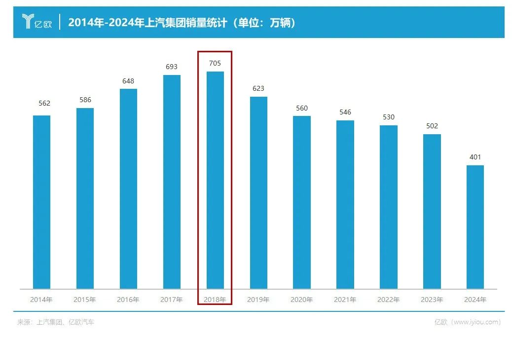 2024年,是上汽集团销量持续下滑的第六年,今年销量下降至401.3万台。