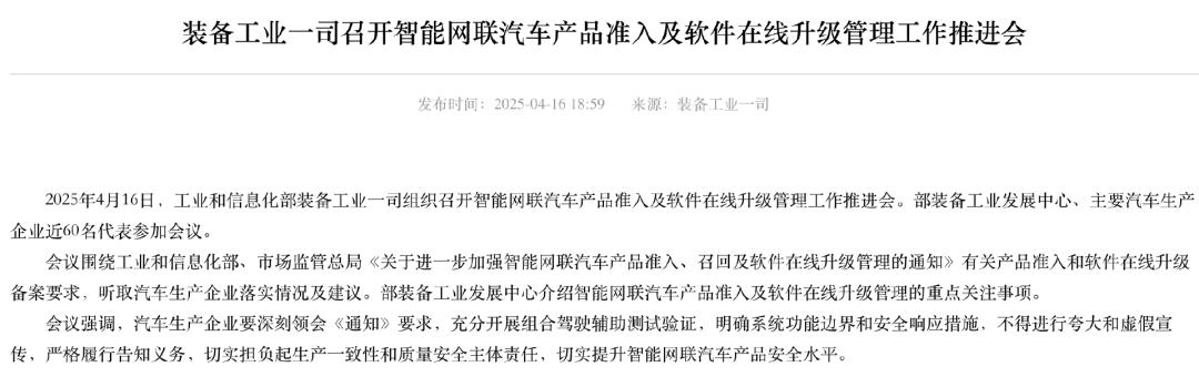 四月十六日,工业和信息化部组织召开智能联网汽车产品准入和软件在线升级管理工作推进会议,对智能驾驶,OTA、对汽车审查和整改提出了新的要求。