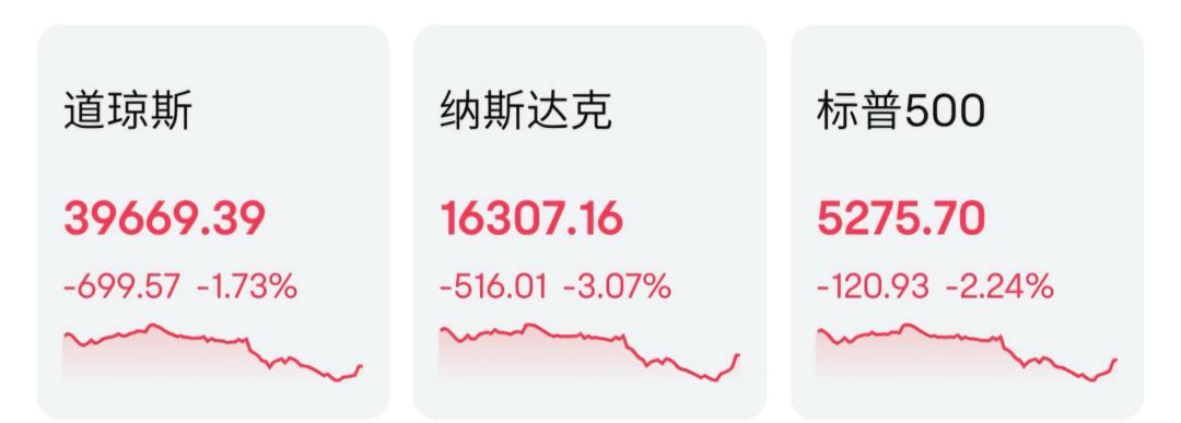 在收盘时,道指跌幅为1.73%;纳指下跌3.07%;标准普尔500跌幅为2.24%。