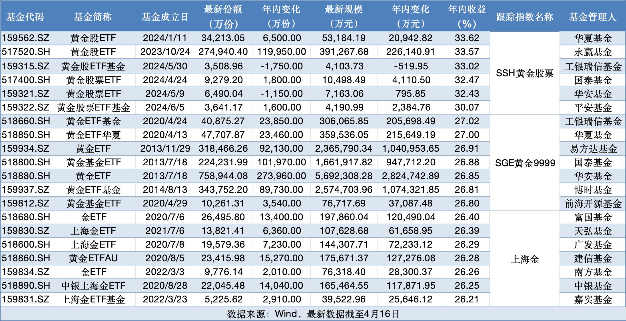 根据Wind的统计,截至4月16日,20只黄金主题ETF的年增长率已超过26%。尽管规模增长最大的是跟踪“SGE黄金9999”的商品,但业绩最好的商品是跟踪“SSH黄金股”的商品,6只ETF上涨超过30%。其中,华夏黄金股ETF收益最高,达到33.62%。