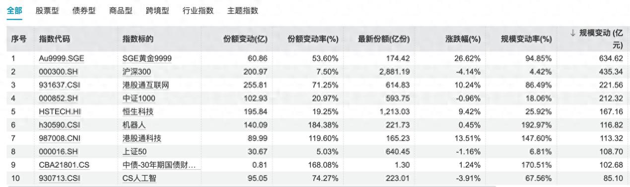 若将时间维度延长至年内,SGE黄金999是今年以来规模增长最大的指数,达到634.62亿元,高于同期沪深300435.34亿元。