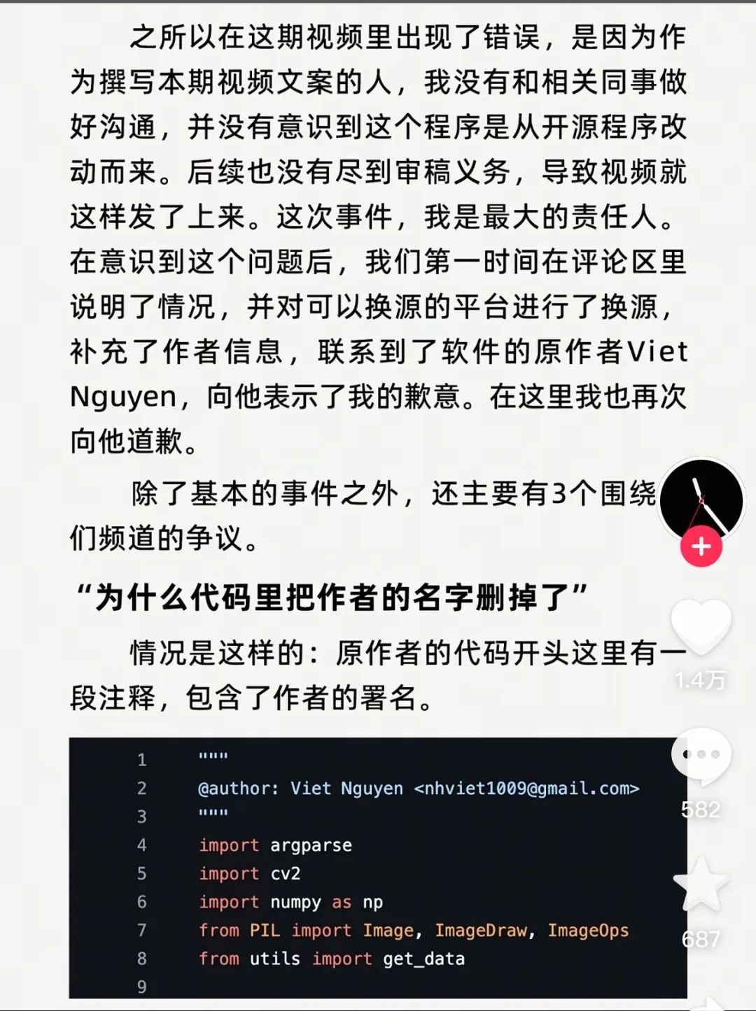 之后何先在视频评论区道歉,承认这个软件确实改变了自己的开源项目。两天后,他发布了一个正式的道歉声明,并下架了这个视频,表示他已经和原作者核对并更换了来源。