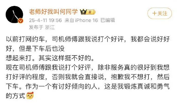 4月11日,何发布微博称,面对司机的好评请求,他会口头同意,但后来忘记了。“现在司机师傅告诉我要表扬,除非服务真的好到让我想表扬,否则我会直接说,对不起,我不想玩,然后直接下车。作为一个有取悦倾向的人,这是我锻炼真诚和勇气的一种方式。”