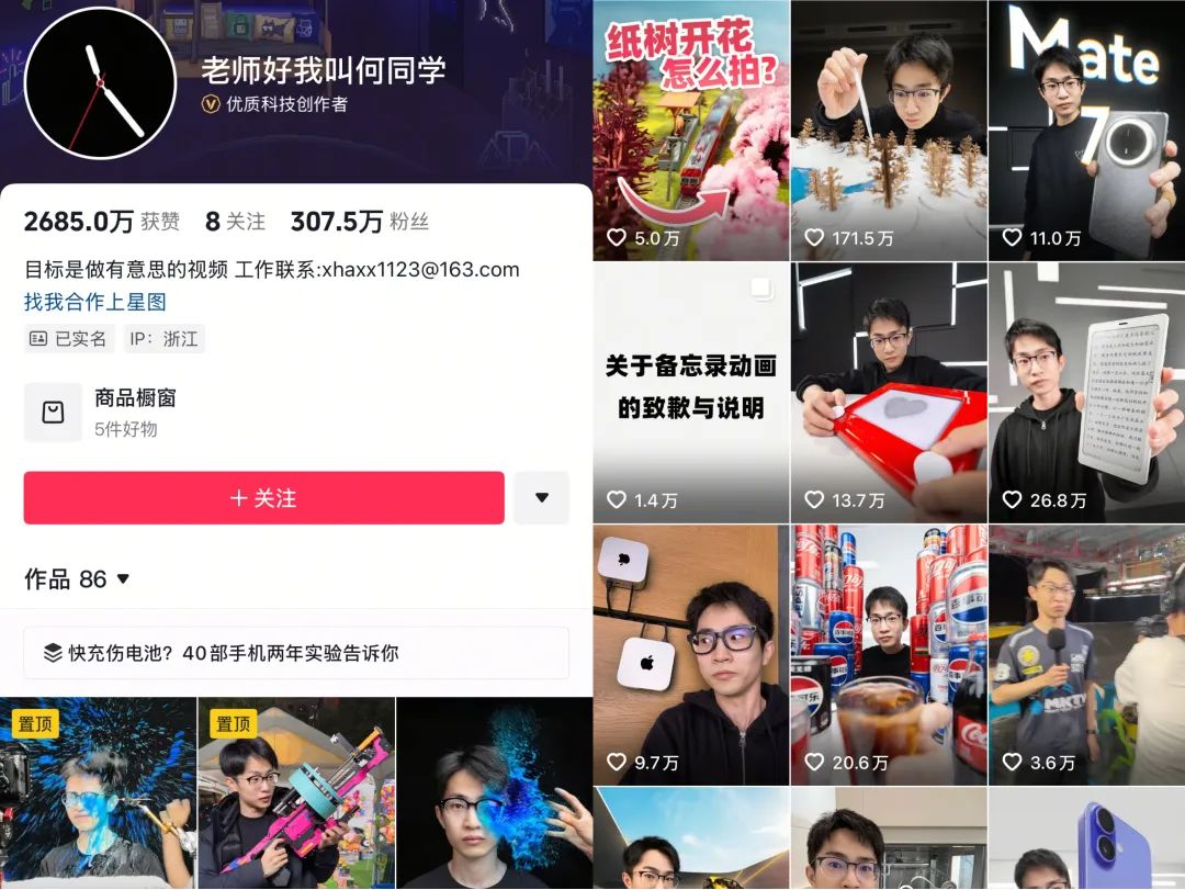 何同学的选择就是继续自己的大咖之路。2020年,他在杭州成立了一个工作室,招募团队帮助他拍摄视频。从2024年开始,@何同学工作室 该账号已成为何同学内容更新的另一个阵地,至今已提交46个视频,积累了数百万粉丝。
