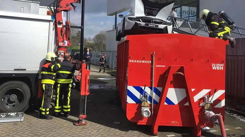 最早在 2019 2008年,荷兰宝马 i8 类似的想法用于火灾事件。它使用起重机,直接将车扔进去。 10 一吨水的水箱,但是这个东西的成本太高了,等到找到合适的水箱和起重机,电池估计都烧完了。