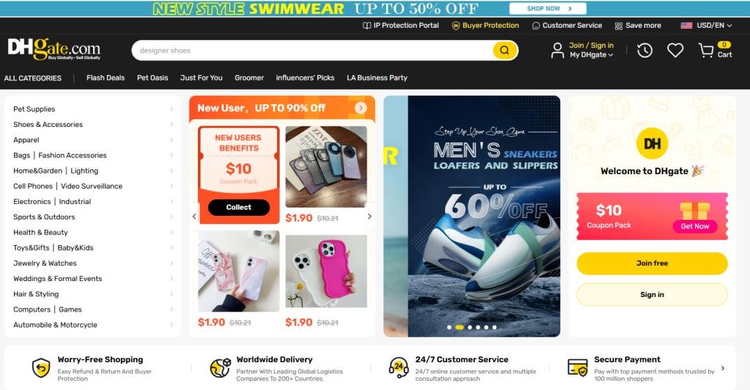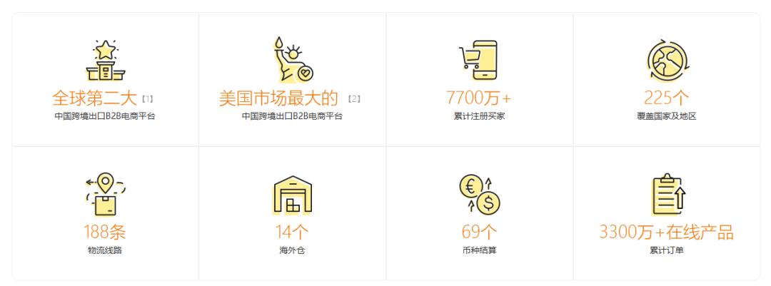 网站显示,敦煌网提供了超过3300万种在线产品,包括电子设备、家居和玩具、鞋服、珠宝、健康和美容等。其注册客户超过7700万,供应商超过250万,覆盖225个国家和地区,拥有14个海外仓库和188条物流线路。
