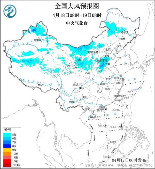 4 月 18 日 8 时至 19 日 8 当时有内蒙古中西部和东北部、新疆北部和南疆盆地、西藏西部、青海东北和南部、甘肃东部、宁夏、陕西中北部、山西中部、河北南部、河南北部、山东北部等地。 5~6 级、阵风 7~8 大风。其中,新疆西北部、内蒙古中部等地的局部阵风可以达到。 9~10 级。