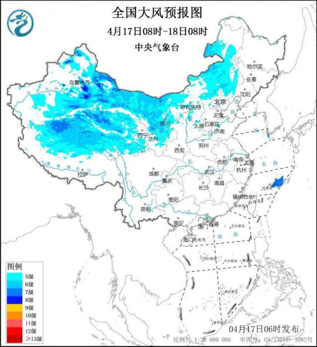 预估 4 月 17 日 8 时至 18 日 8 当时,新疆、西藏、青海、甘肃、河西、中部、宁夏、内蒙古、河北等地大部分都有 5~6 级、阵风 7~8 级的大风。其中,新疆东部、西藏西部、青海西部等地的局部阵风可达 9~10 等级,新疆风口阵风可以达到 12 级别左右;黄海东南部的一些水域将有 7 级、阵风 8 等级的西南风。