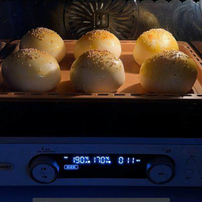 5、发酵面团表面涂有蛋液,撒上芝麻 烤箱上下火 170/190 度烤 15 分钟