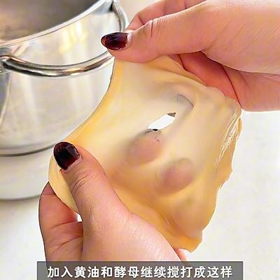 2、将黄油和酵母放入面团厚膜中,放入图片中。面团靠近手套膜。 3 档 3 分钟转 5 档 5 分钟(接近手套膜的程度)