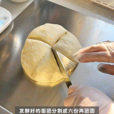 3、基本发醇的面团,发酵至两倍大后分成六份