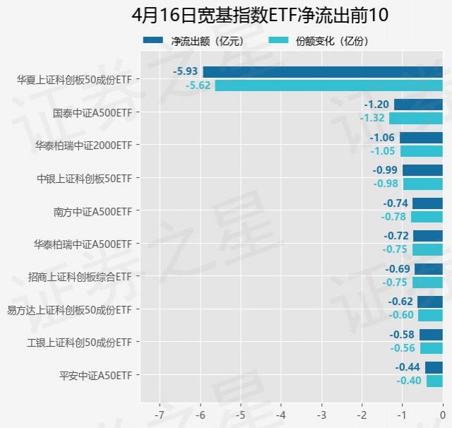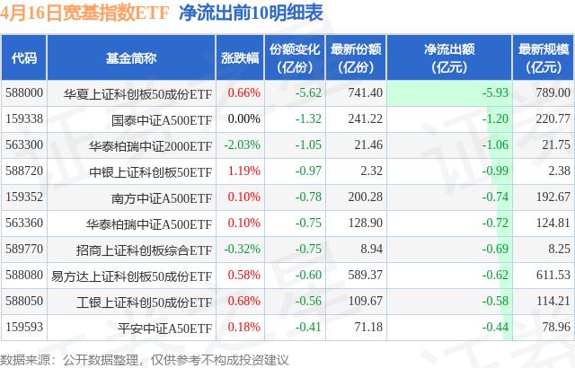 当天有 97 只宽基指数 ETF 资金净流出出现在基金中,其中华夏上证科技创新板排名第一。 50 成分 ETF(588000),份额下降 5.62 一亿份,净流出额为 5.93 亿元。