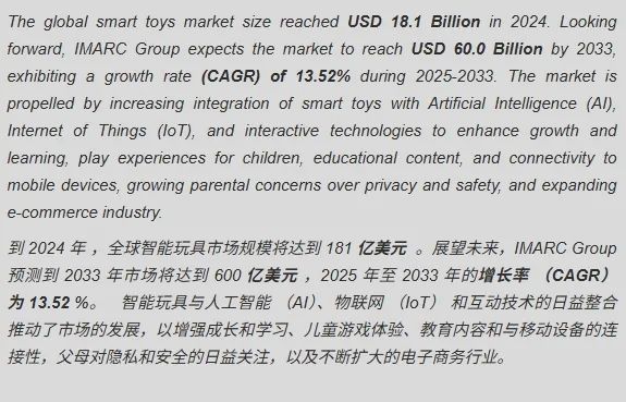 AI玩具作为AI硬件的新兴跑道之一,市场增长非常迅速。根据咨询公司IMARC集团的数据,仅2024年市场规模就已达到181亿美元。如果以2024年全球玩具市场的1080亿美元市场计算,其比例已接近20%。
