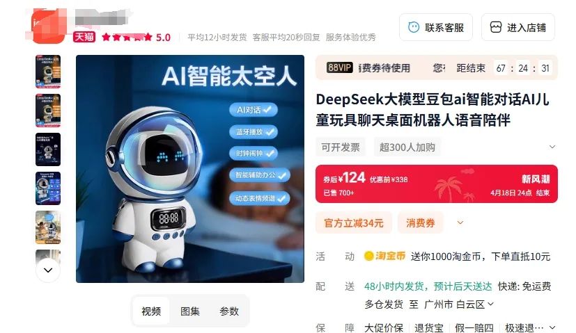 而且从淘宝的搜索结果来看,这些主要推广AI功能的商品销量也相当不错,从几百到几千不等。在不受欢迎的IP和不便宜的价格下,它们的平均销量远高于许多玩具类型。