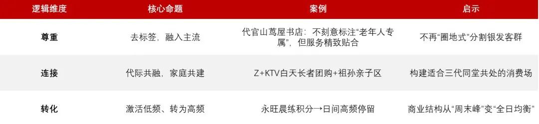银发人群自然具有“反峰值”的时间弹性优势,这意味着他们可以灵活使用非高峰时间,而不受传统高峰时间的限制。通过营造“无龄感”的环境,购物中心可以调整低频客户的生活节奏,将这些消费者的光顾习惯从偶尔转变为日常停留,从而填补所谓的“冷时间”。