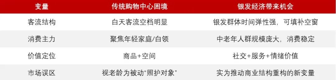与此同时,购物中心增加的传统动能正在下降。工作日白天,“空窗期”越来越明显,年轻家庭的消费频率趋于分化,线下流量收入下降已经成为常态。银发人群提供了结构性填补“空档”的可能性,时间相对充裕,消费能力稳定,精神文化需求日益增长。