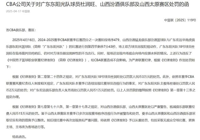 罚款官方公告:杜润旺挑衅罚款3万,杜锋朱芳雨连同罚款,山西罚款15万。