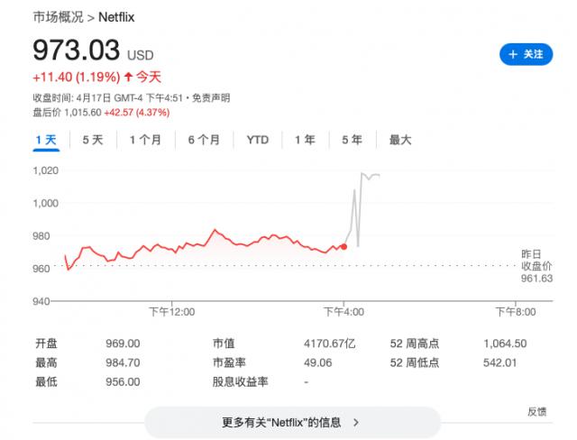 Netflix 今年以来,在经济不确定性环境中表现最为突出的“科技巨头”之一,Netflix 股票价格已经上涨了 在各种科技公司中,9%的表现引人注目。财务报告公布后,Netflix 周四盘后涨超 4.3%,报 1015.60 美金。
