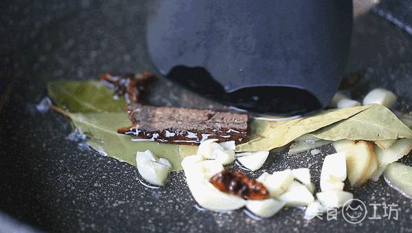 3. 将油放入热锅中,加入姜片大蒜、八角、桂皮、香叶爆香。