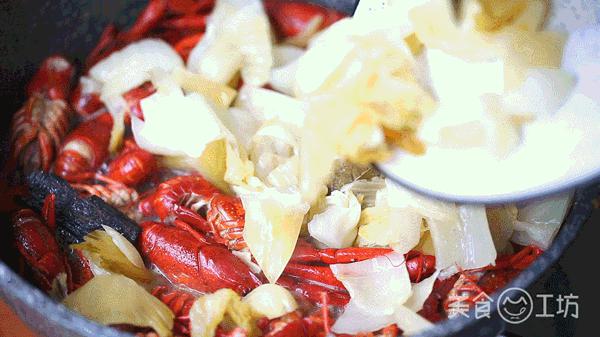 6. 然后倒入切好的泡菜,大火煮三分钟,然后用小火煮,不用盖锅盖煮。 6 等待龙虾进味后的盛盘。