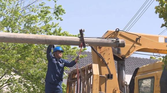 四月十四日,在山阳镇华新村,施工人员正在有条不紊地拆除路边的废弃电线杆,并对电线杆上非法交越搭挂的线路进行全面整治。