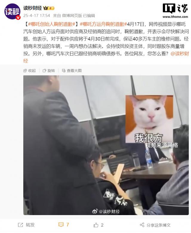 IT 之家 4 月 17 据读秒财经今日报道,网爆视频显示,哪吒汽车创始人方运舟在面对供应商和经销商的询问时,鞠躬道歉,并表示会尽快解决问题。。