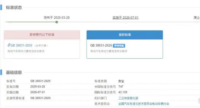 工业和信息化部门 4 月 3 日本正式发布 GB 《电动汽车动力电池安全要求》38031-2025。