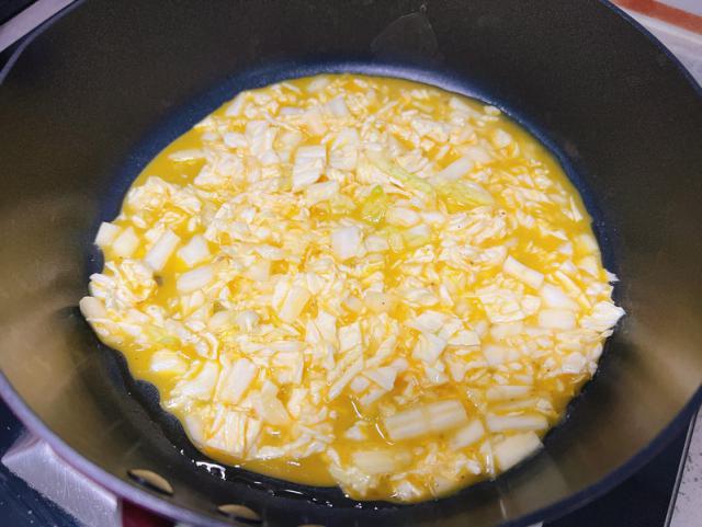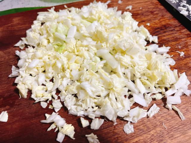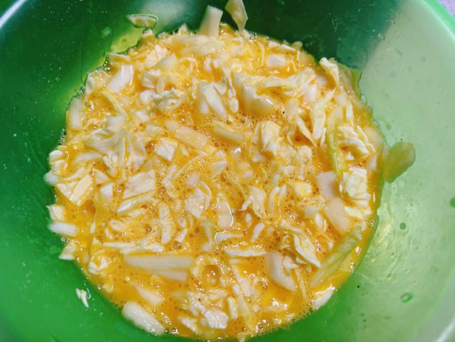 将白菜碎放入蛋液中,充分搅拌均匀,静置。