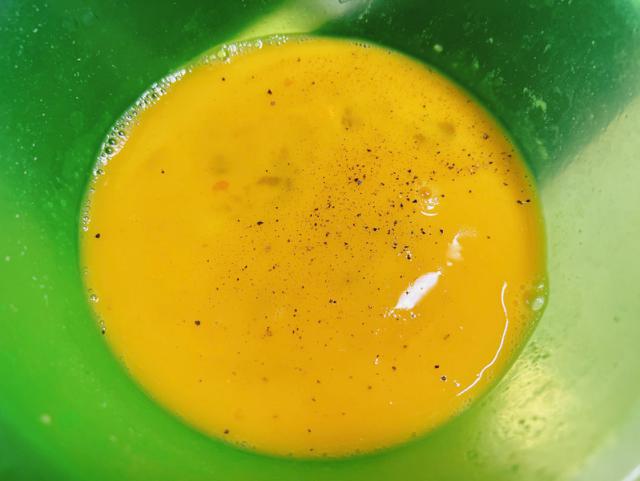 2 一个鸡蛋打散,加入海盐胡椒调味,大概扭曲。 2-3 下就行。