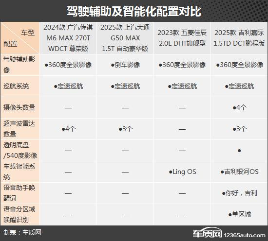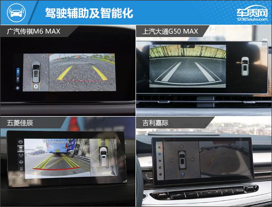 在驾驶硬件方面,吉利嘉际提供了 4 个摄像头、360 全景图像和透明底盘的功能领先于其他三款车型。上汽大通 G50 MAX 只是提供倒车影像,方便稍微受到影响。