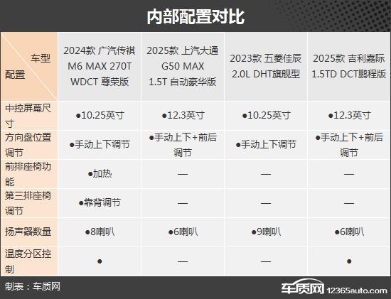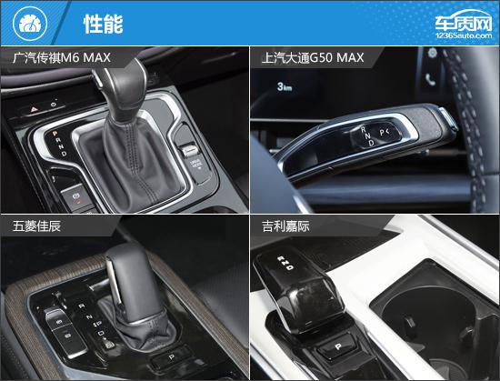 与广汽传祺相比,内部配置方面 M6 MAX 性能更好,占据了前排座椅加热和第三排座椅背面调节的功能。然而,方向盘只有上汽大通。 G50 MAX 上下支持吉利嘉际 前后调整,其它两款车只支持上下调整。