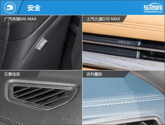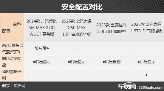 在安全配置方面,广汽传祺 M6 MAX 独享前 / 后排头部安全气囊(气帘),而吉利嘉际配备的道路救援呼叫是其他三款车型所没有的。另一方面,五菱佳辰整体表现较差,胎压监测功能仅为胎压报警,实用水平不如胎压显示。