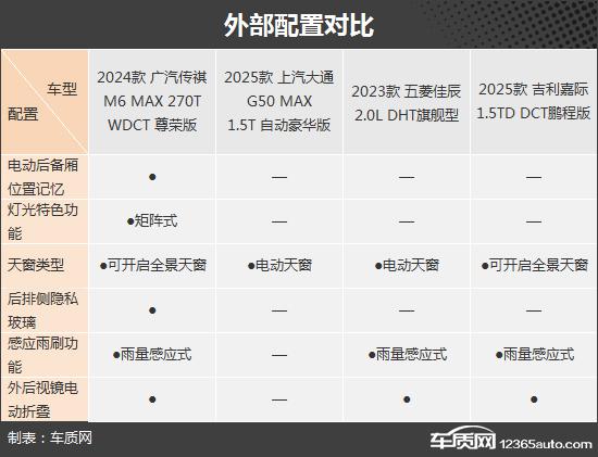 在外部配置上,广汽传祺 M6 MAX 表现最好,独家电动后备箱位置记忆,矩阵大灯,后侧隐私玻璃等。相比之下,上汽大通 G50 MAX 外部设备表现较为寒酸。