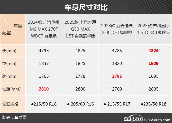 在车身长度方面,吉利嘉际的车身长度和总宽度占优势,在车内空间关键数据轴距方面,以及领先的广汽传祺 M6 MAX 差别不大,总体来说表现不错。相比之下,五菱佳辰的车身长度一般。