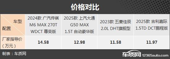 这次推荐的四款车是广汽传祺。 M6 MAX、上汽大通 G50 MAX、五菱佳辰与吉利嘉际。由于这一级别的车型较少,所以四款车的售价略有不同。